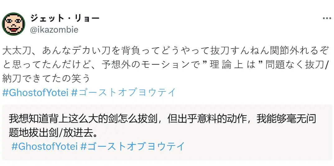 没想到分享后便引起许多玩家讨论,其中多位日本剑术家更是出面证实此事,对此一名天心流剑士 Maako 更是成功从左肩拔出一把长 1 米、重 1.5 公斤的太刀。 而另一名剑术家 Lornplum 也亲自演示一段关于拔刀过程,认为「笃」拔刀抓住刀背的处理方式相当巧妙,并且细节非常写实,但他也表示主角的收刀方式则不太可能在现实中重现。